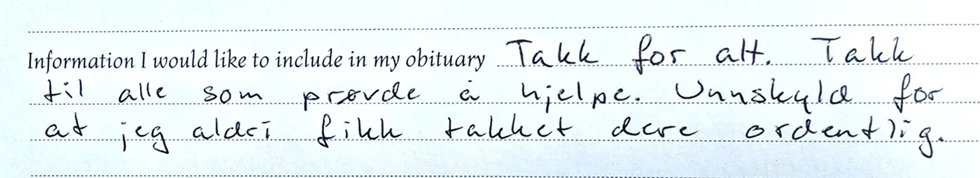 Du fylte livet rundt deg med noe helt eget – med en ekte og ærlig latter som kom trillende rett fra hjertet, med et smil som var umulig å ikke bli glad av, med stor og varm kjærlighet til musikk, bevegelse, dyr, natur og mennesker. Du hadde en unik evne til å se andre – og til å lyse opp rom du kom inn i.